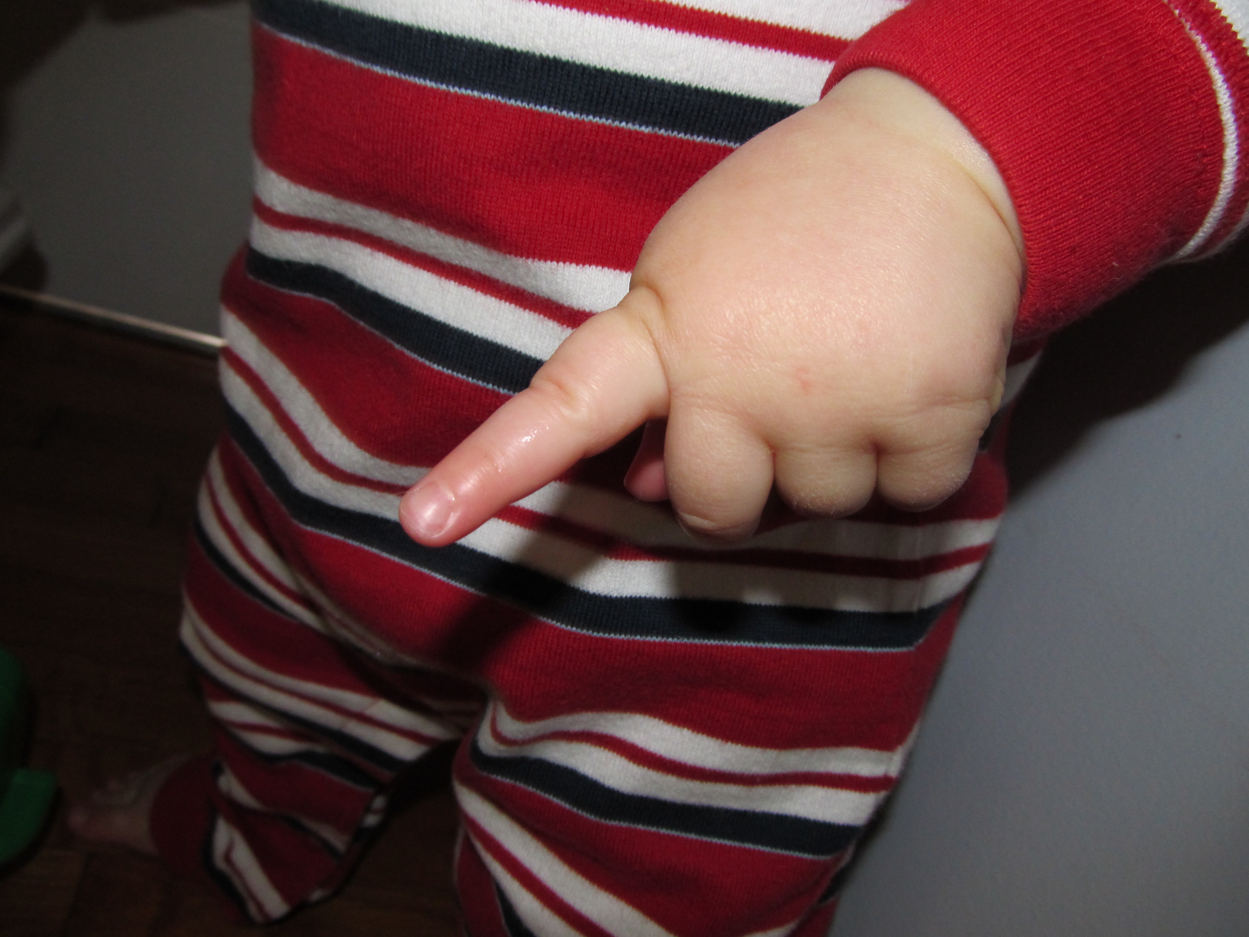 Maybe he was pointing to the sun shining in the bright blue sky?  Or this vinyl chair in the playroom.  (I guess the camera strap gave it away.)