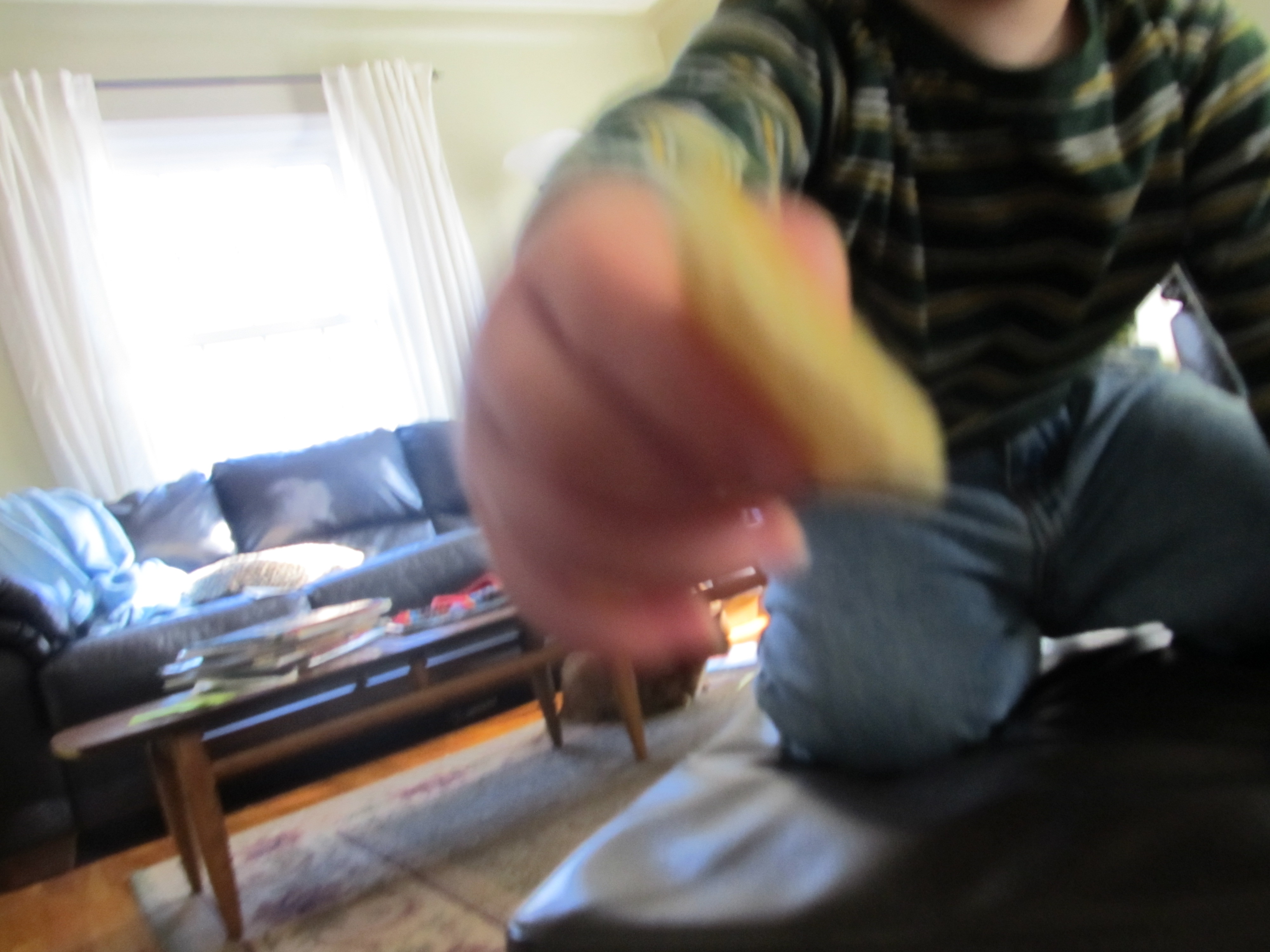 Her brother trying to feed a cracker to the camera