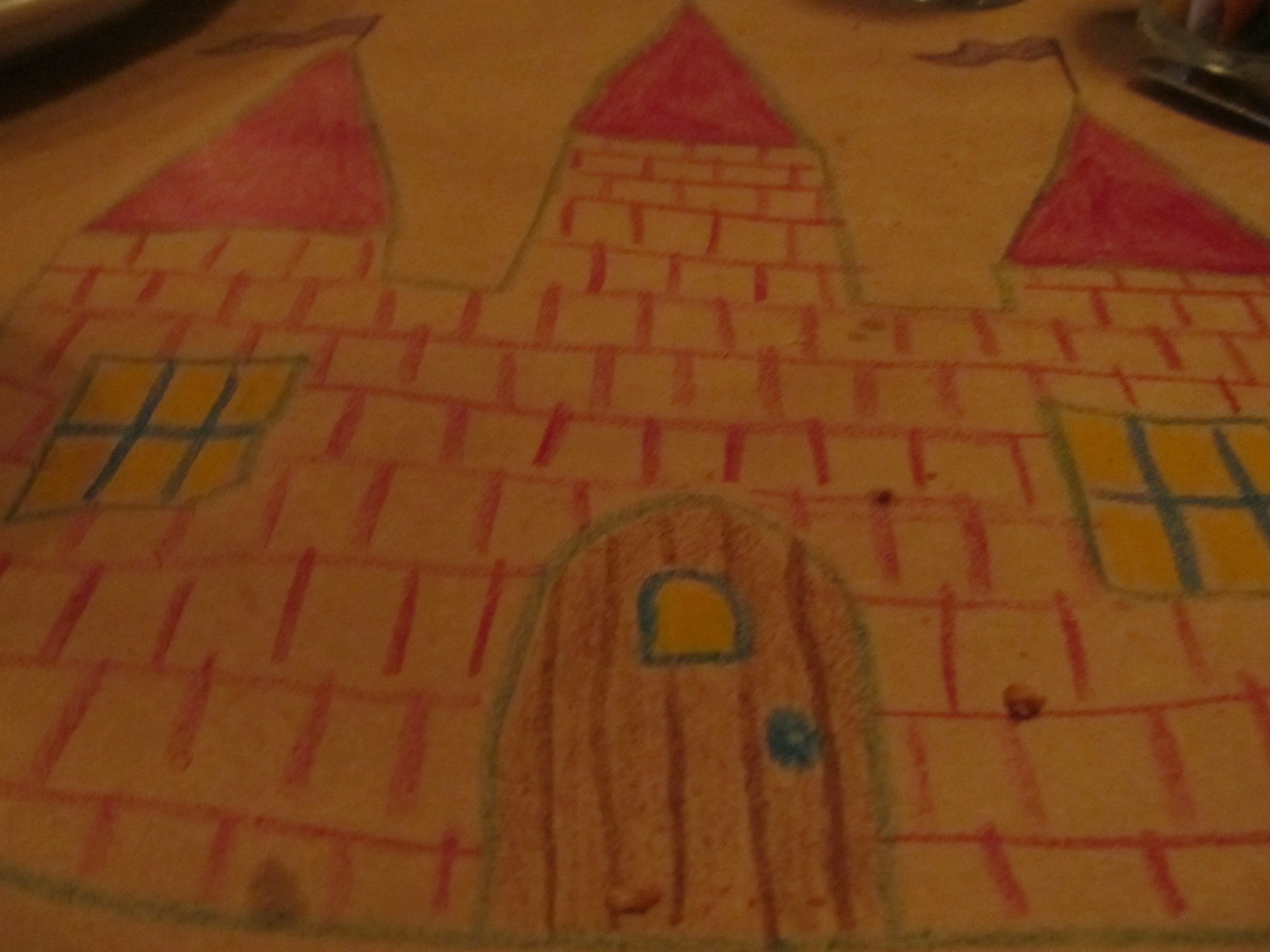 We ate lunch today at a restaurant where you can draw on the tables. Beatrix was being, shall we say, not so great. We were eating with my aunt and uncle and she kept griping "We don't even know these people. Why are they sitting with us?" I occupied her by letting her choose colors for me to draw her a castle. See, a year ago, I would've just ordered another Bloody Mary. Now I'm able to deal with the crankiness. Thank you, Zoloft. (Of course, the one Bloody Mary I did have was delicious).